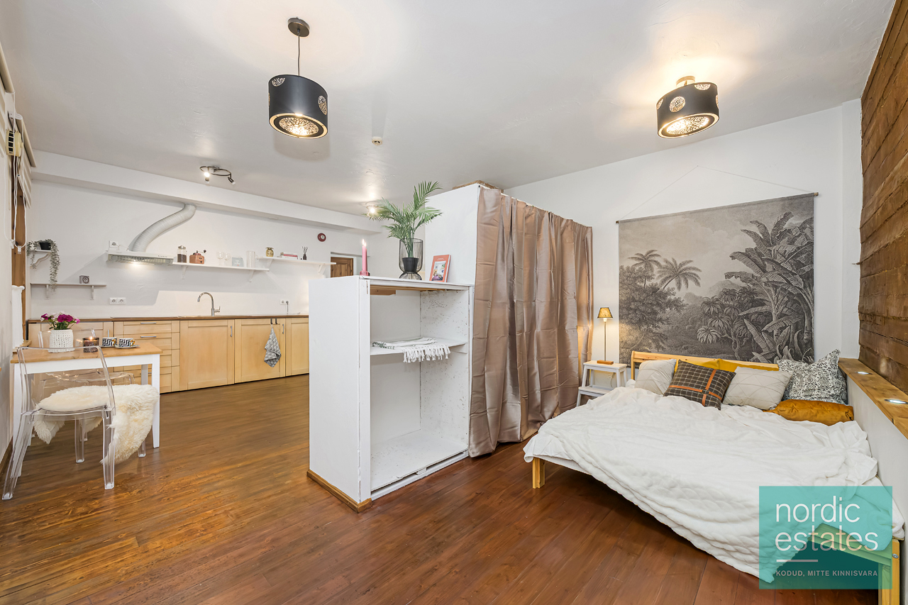 MÖÖBEL, mis on korteris: voodi (madratsita), riidekapp, köögimööbel, kuhu on peidetud ka pesumasin, riiulid, söögilaud. Vajadusel võimalik lisa.