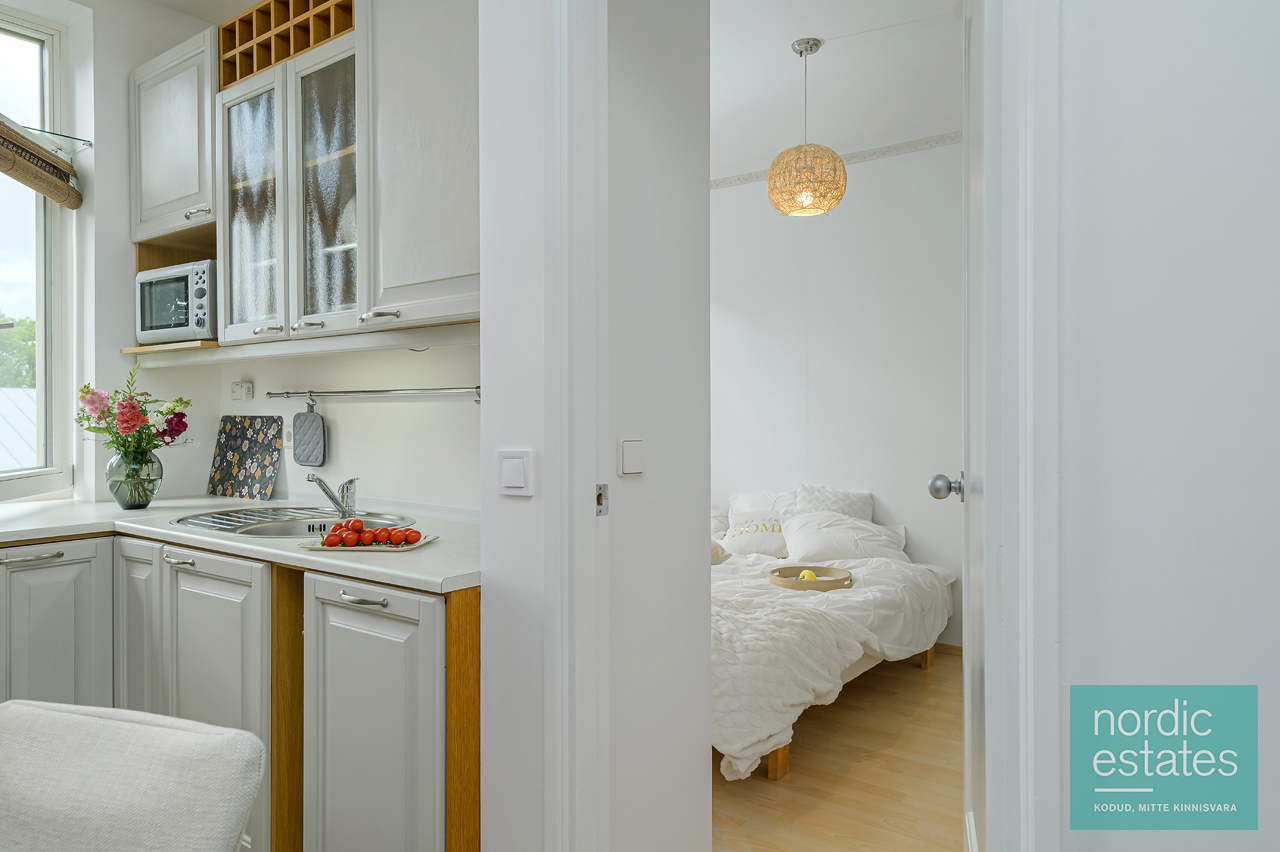 KORTER, mis asub kolmadal korrusel ja mille akendest avanevad vaated salajastele tagahoovidele on oma olemuselt valge ja helge. Siit aknast välja vaadates puhkab silm olenemata aastajast. Sellest kodust leiad esiku, erkeliga elutoa, mis sujuvalt läheb üle köögiks, magamistoa ja armsa siseaknaga vannitoa. Sisekujundus laseb mõttel puhata ja värskelt mõjub roheline kahhelahi (ei ole hetkel töökorras). Selles kodus on hoitud hoolega vana (põrand, siseuksed) ja austusega lisatud uut.