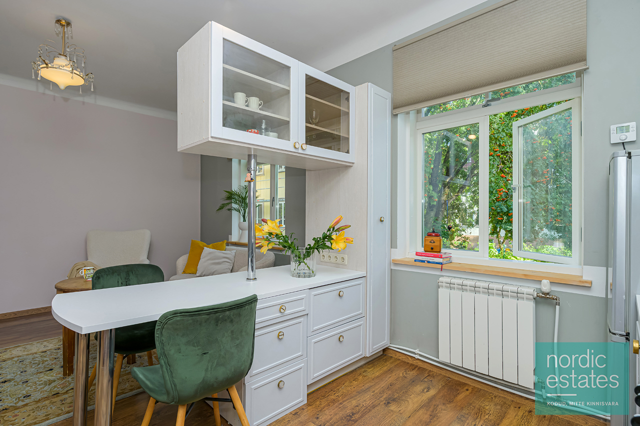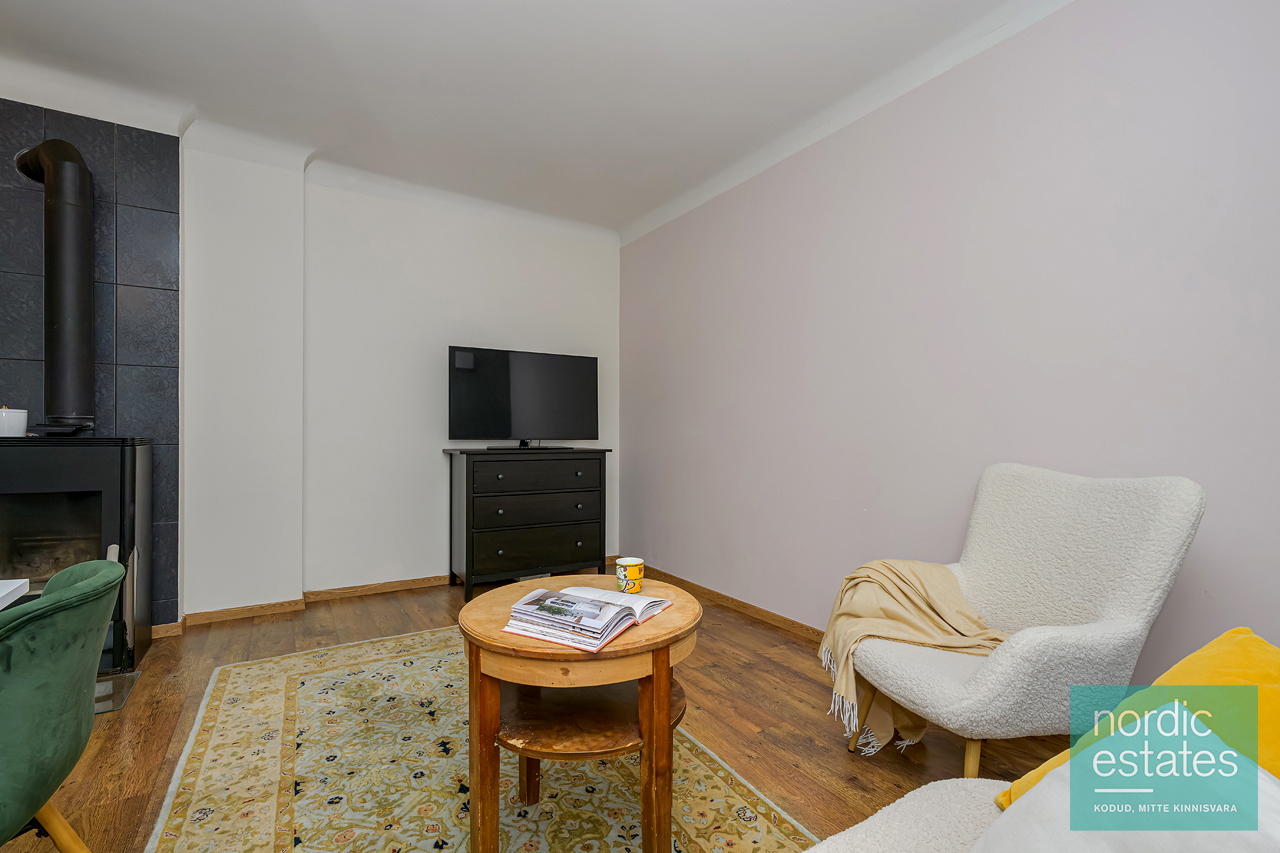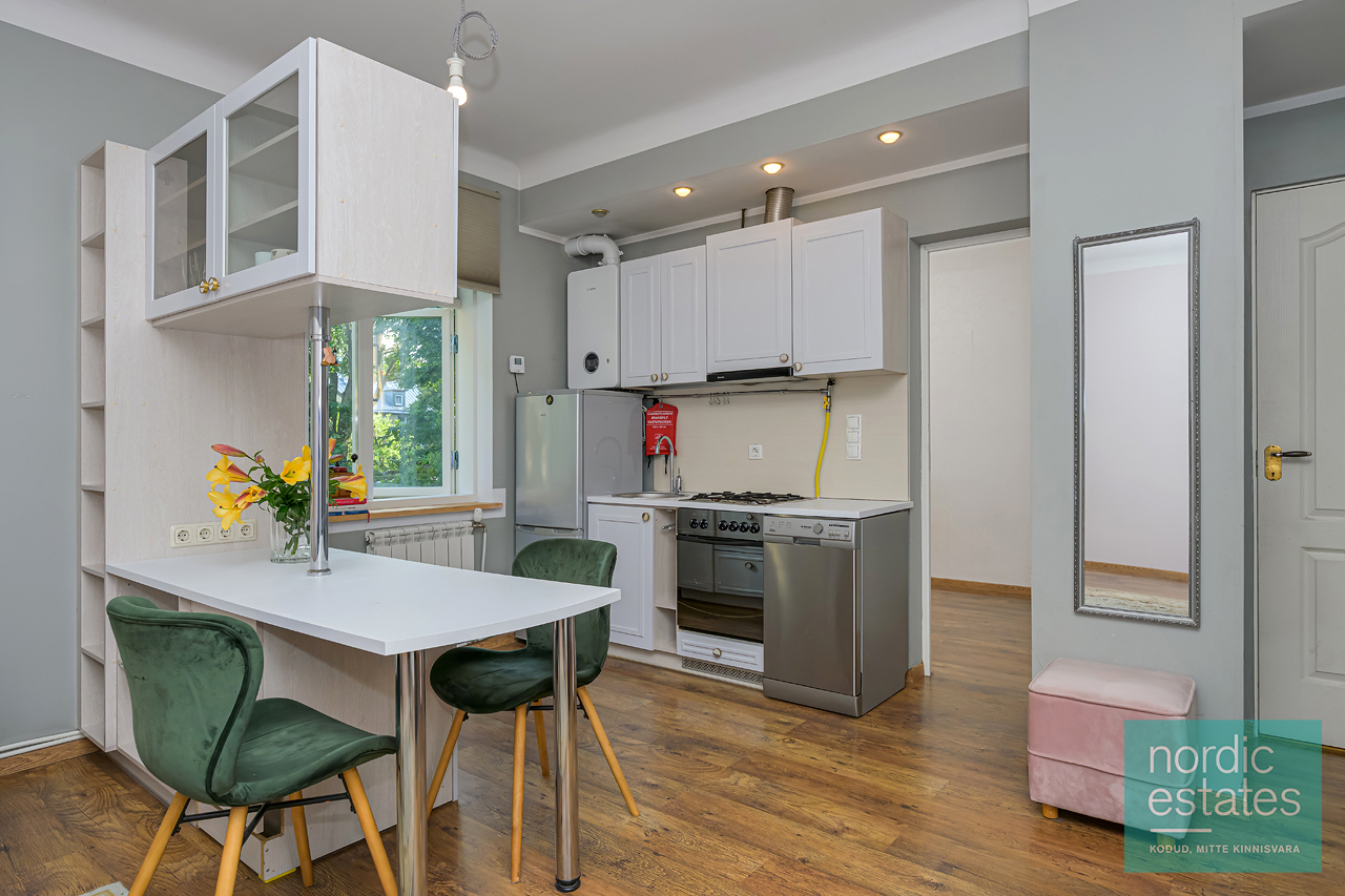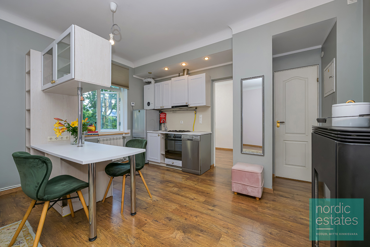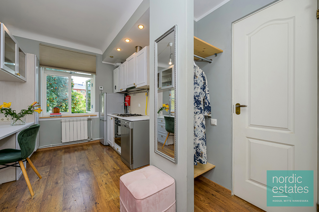 KORTER asub renoveeritud puitmaja kõrgel esimesel korrusel, vaatega rohelisse sisehoovi. Siit ei leia Sa asjatuid ruutmeetreid aga samas on kõik olemas, pisike esik, elutuba koos kööginurgaga, vannituba ja magamistuba. Üleliige hoiustamiseks panipaik. Mööbel valdavas osas juba Sind ootmas, puudu on veel Sinu isiklik voodi. Magamistuba on pisike, ent siit ei puudu ka garderoob. Toasooja tagab gaasiboiler, mis on Sinu enda reguleerida. Kui aga soovid end elava tule paistel soojendada, siis ka see võimalus olemas kamina näol. Kodu on kujundatud soojades toonides, jättes Sulle võimaluse tuua sisse värve oma tekstiiliga.