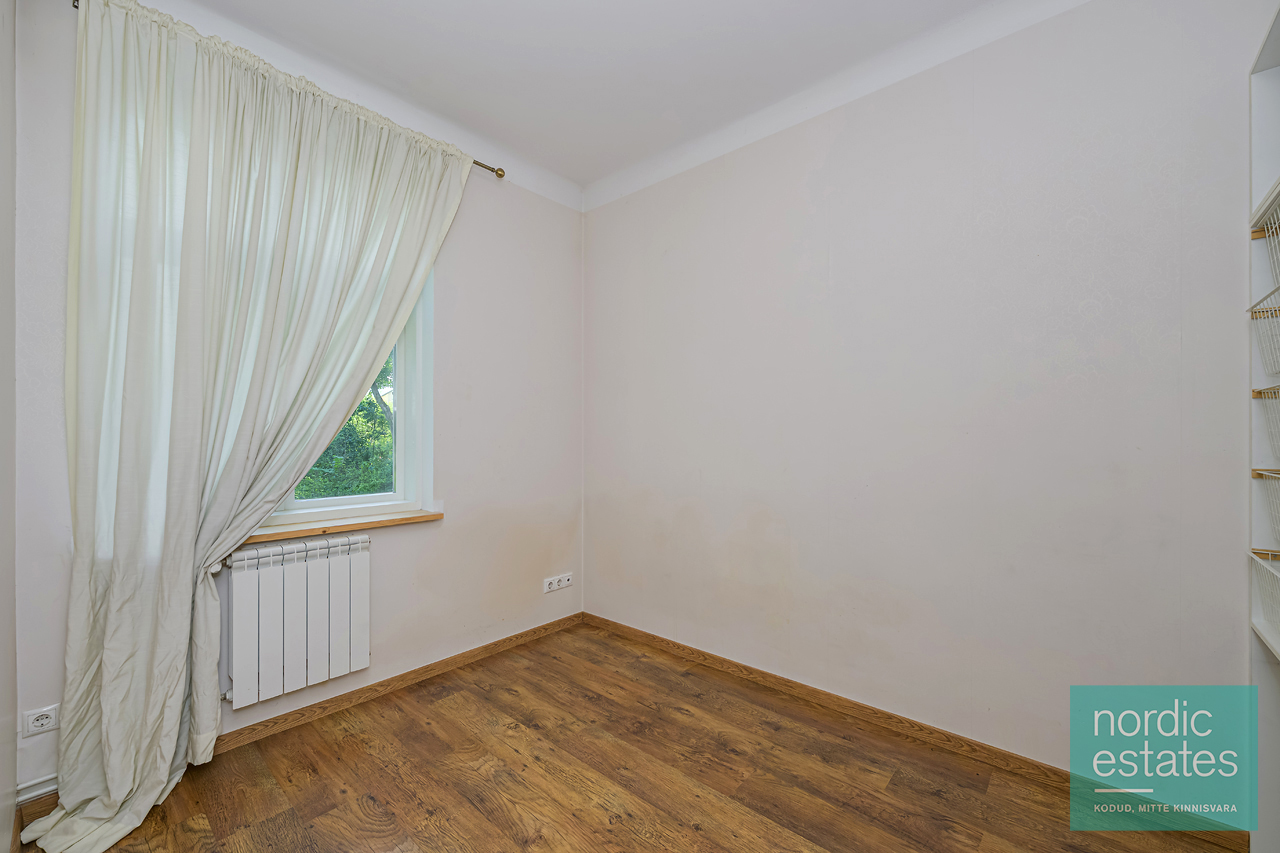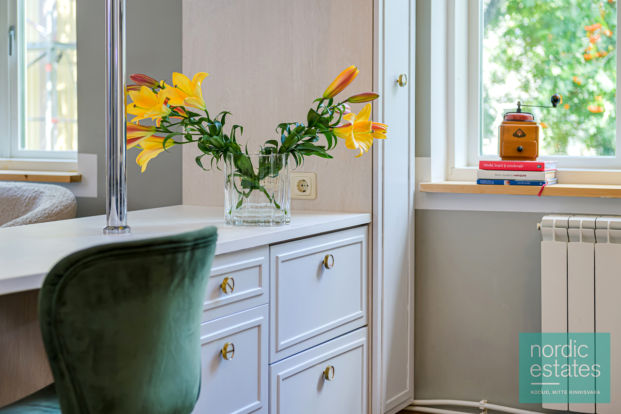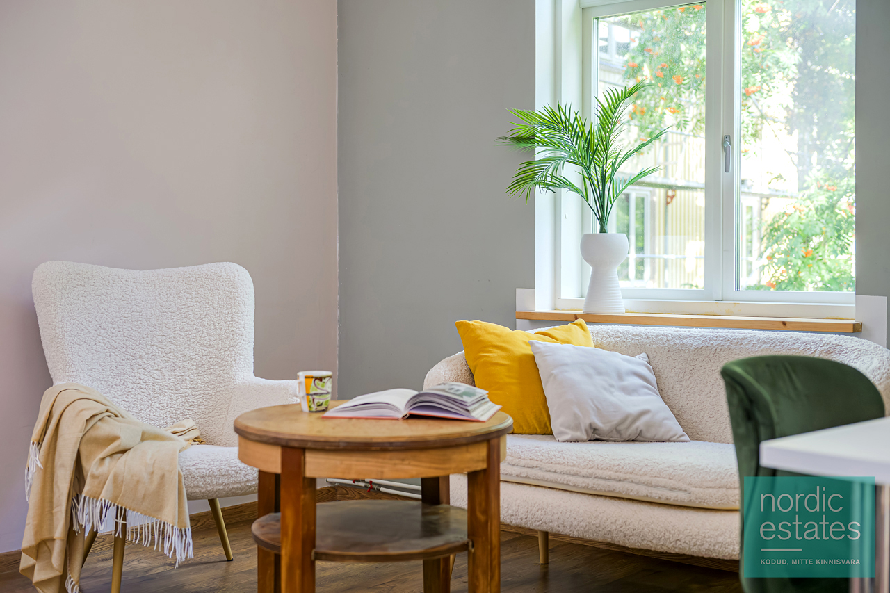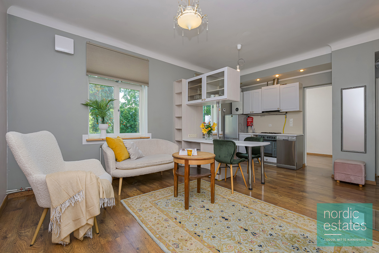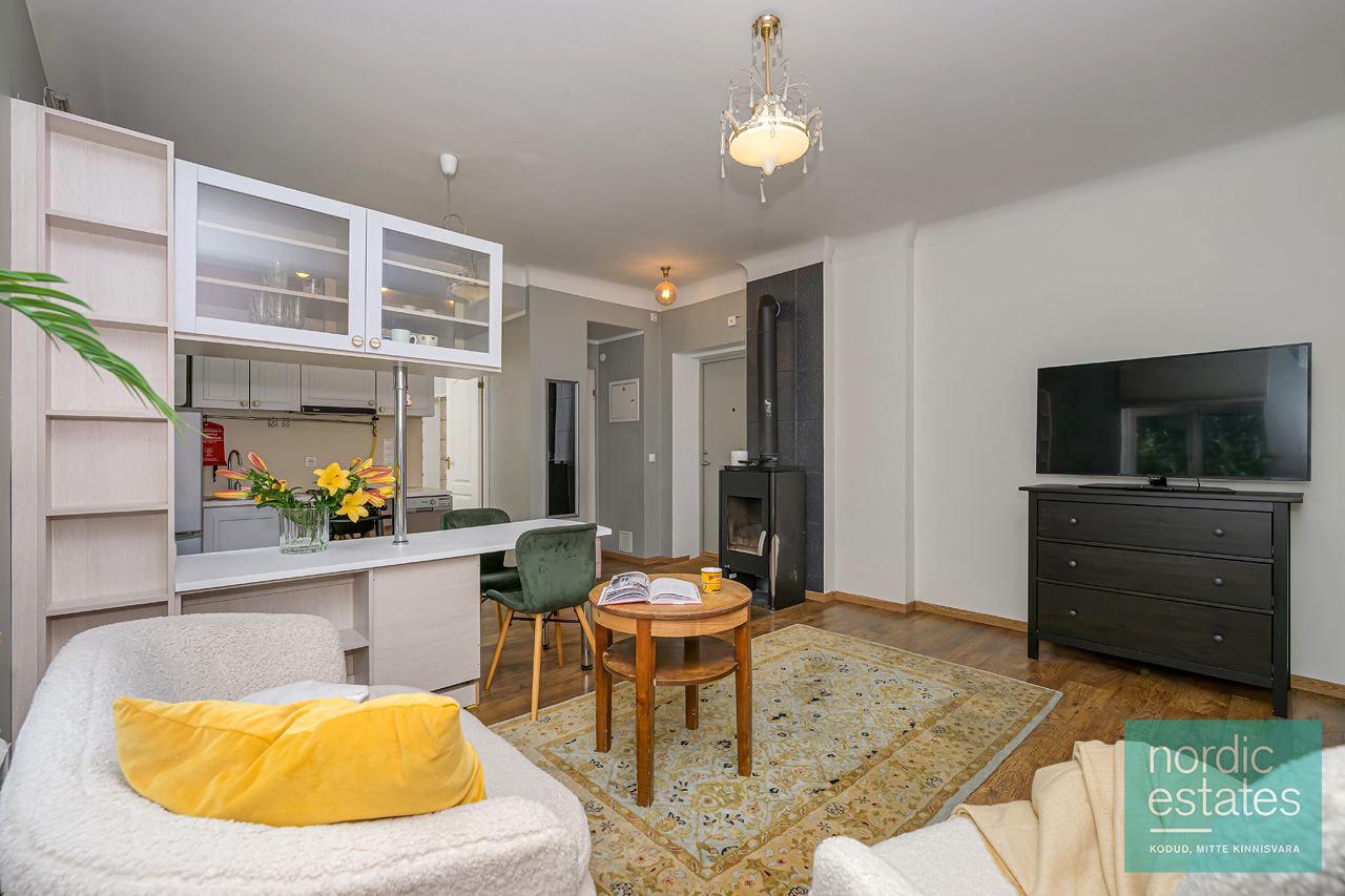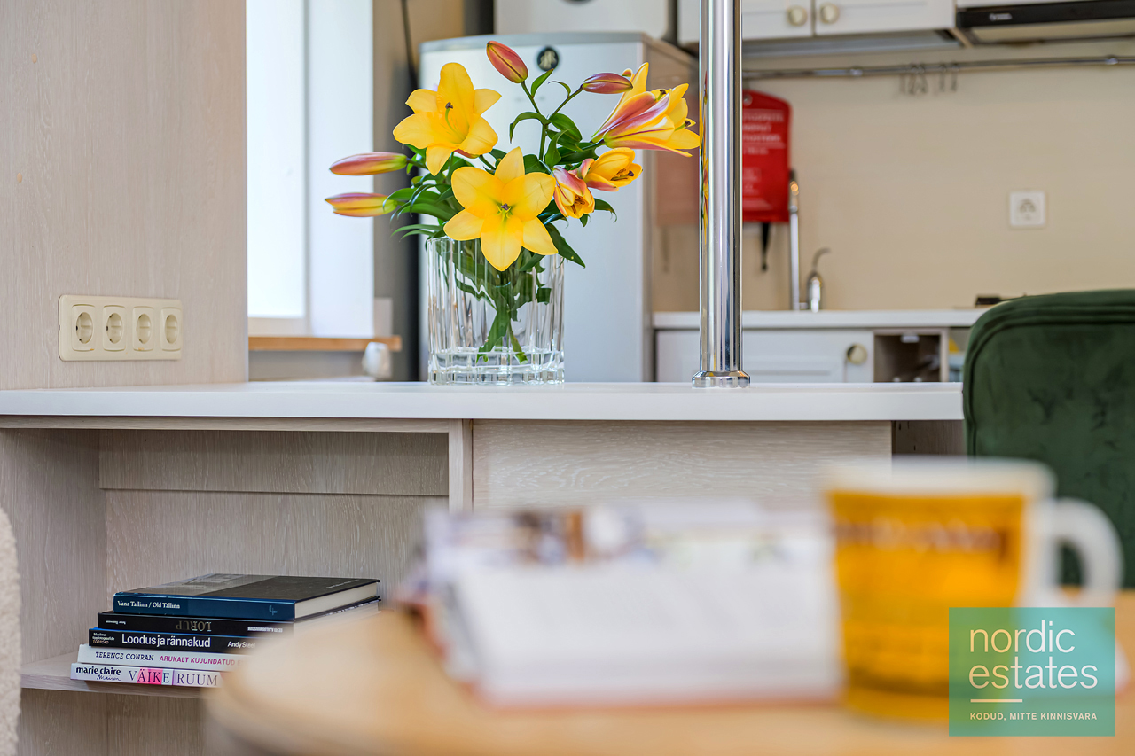 KORTER asub renoveeritud puitmaja kõrgel esimesel korrusel, vaatega rohelisse sisehoovi. Siit ei leia Sa asjatuid ruutmeetreid aga samas on kõik olemas, pisike esik, elutuba koos kööginurgaga, vannituba ja magamistuba. Üleliige hoiustamiseks panipaik. Mööbel valdavas osas juba Sind ootmas, puudu on veel Sinu isiklik voodi. Magamistuba on pisike, ent siit ei puudu ka garderoob. Toasooja tagab gaasiboiler, mis on Sinu enda reguleerida. Kui aga soovid end elava tule paistel soojendada, siis ka see võimalus olemas kamina näol. Kodu on kujundatud soojades toonides, jättes Sulle võimaluse tuua sisse värve oma tekstiiliga.