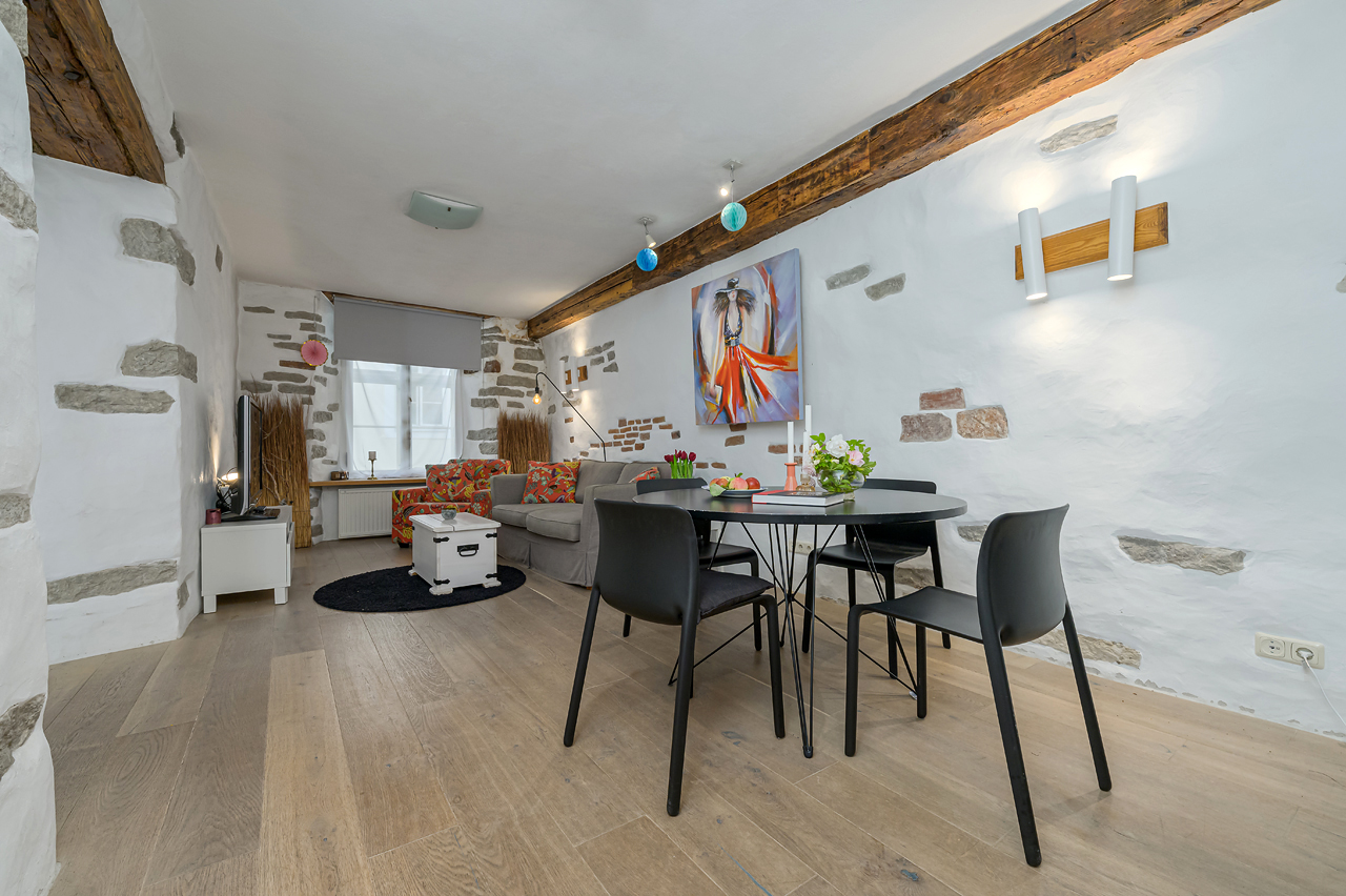 Keskaegses kaupmehe majas asub 3.korrusel läbimaja planeeringuga kodu, mis tänapäeva inimesele mõjub samaaegselt nii kutsuvalt kui kaasaegselt, sest olemas on kõik mugavused. Isegi auto saad parkida kindlale kohale hoovis!